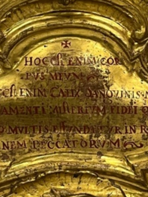 Justo a los pies de la imagen, en el centro del banco del retablo, se encuentra una cartela escrita en latín, casi tallada en oro, que recoge las palabras más sagradas de la liturgia: HOC EST ENIM CORPUS MEUM… HIC EST ENIM CALIX SANGUINIS MEI, NOVI ET AETERNI TESTAMENTI: MYSTERIUM FIDEI, QUI PRO VOBIS ET PRO MULTIS EFFUNDETUR IN REMISSIONEM PECCATORUM. Son las palabras de Jesús en la Última Cena. El centro mismo de la fe cristiana. La Eucaristía proclamada en oro. Porque si algo merece ser escrito, es ese milagro cotidiano que ocurre sobre cada altar.