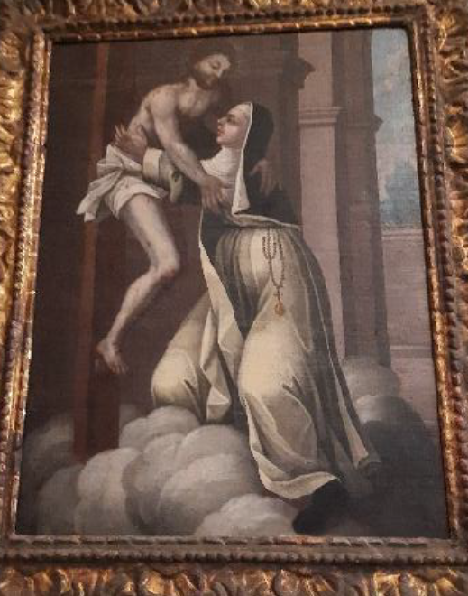 La representación de Cristo descendiendo de la cruz para abrazar a un santo o santa es un motivo que se encuentra en diversas obras del barroco español e italiano, reflejando la creencia en la unión mística entre el alma y Dios. La postura de la santa, con su hábito decorado con un rosario y medalla, sugiere una relación con órdenes monásticas dedicadas a la contemplación y el recogimiento.